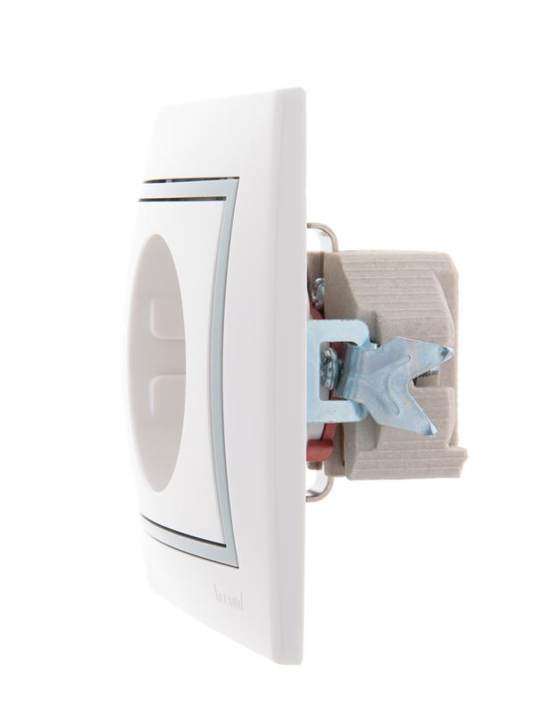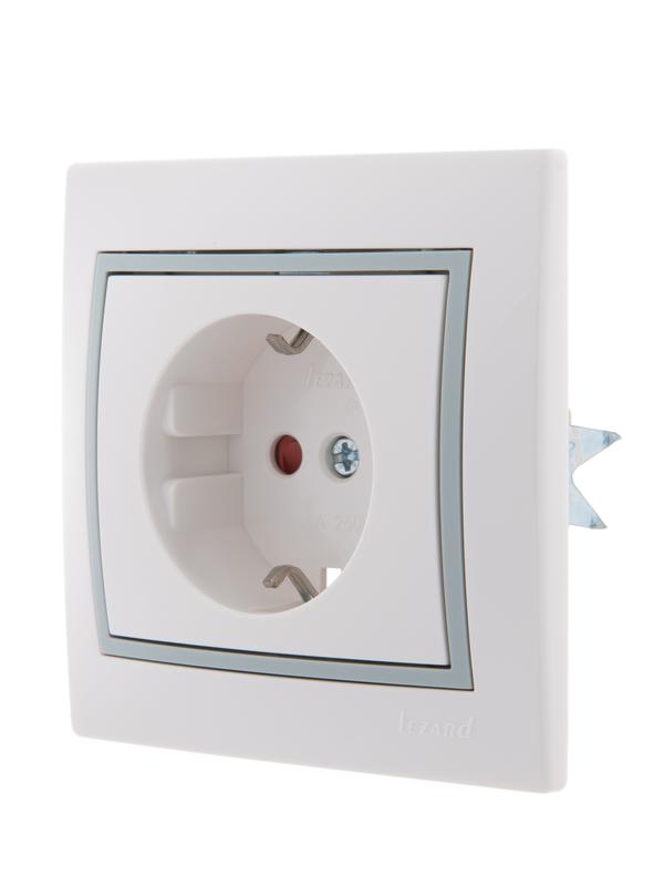 Корпус представляет собой форму из негорючего пластика, белого цвета, с защитными шторками, автоматически закрывающими гнезда розетки при вынутой вилке. Основание керамическое. Подпружиненные лапки крепления обеспечивают комфортный и легкий монтаж изделия. Предусмотрена возможность установки без применения монтажной коробки.