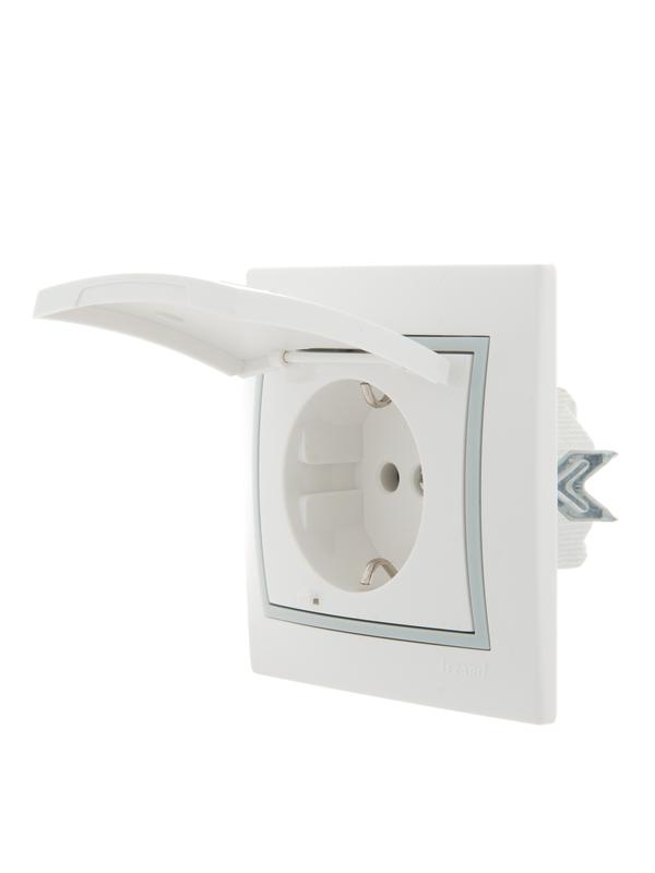 Корпус представляет собой форму из негорючего пластика, белого цвета, с защитными шторками, автоматически закрывающими гнезда розетки при вынутой вилке, и защитной крышеой полупрозрачного серого цвета. Основание керамическое. Подпружиненные лапки крепления обеспечивают комфортный и легкий монтаж изделия. Предусмотрена возможность установки без применения монтажной коробки.