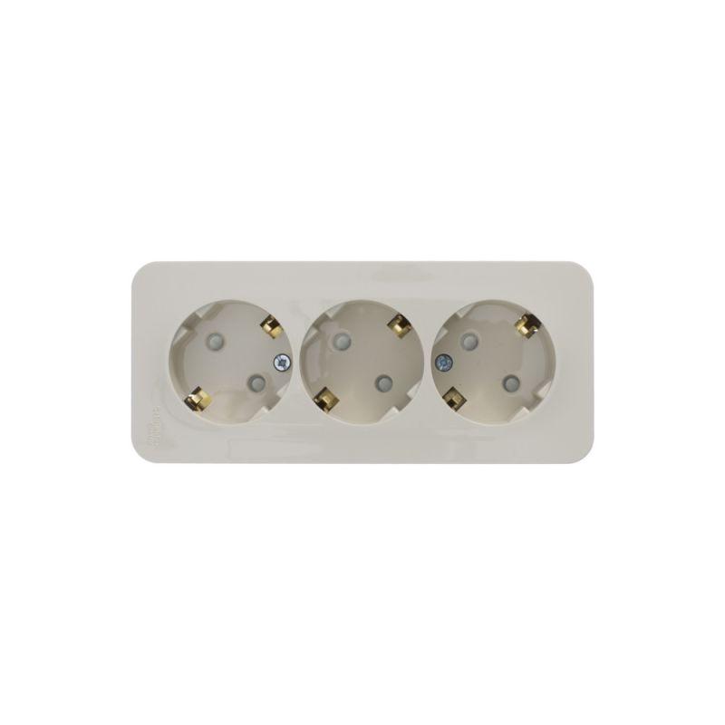 Розетка Systeme Electric (ранее Schneider Electric) BLANCA (открытой установки, цвет бежевый) трёхместная с заземлением и шторками, с изолирующей пластиной подходит для сетей 250 В, на ток 16 А. Заземляющий контакт обеспечивает дополнительную защиту от удара электрическим током. При наличии заземления электрический потенциал уходит в землю, защищая человека. Входные отверстия расположены под углом 45 градусов, благодаря чему можно подключить несколько устройств: вилки и адаптеры не будут мешать друг другу. Корпус изделия выполнен из ABS-пластика.