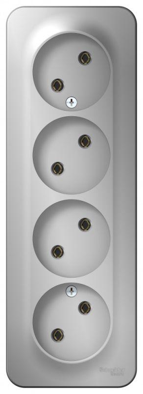 Розетка Systeme Electric (ранее Schneider Electric) BLANCA (алюминий, открытой установки) четырехместная, без шторок и заземления, с изолирующей пластиной предназначена для сетей до 250В, на ток до 16А. Четырехместная розетка позволяет подключить четыре устройства в одном месте. Она изготовлена из ABS-пластика, проста в установке и удобна в применении.