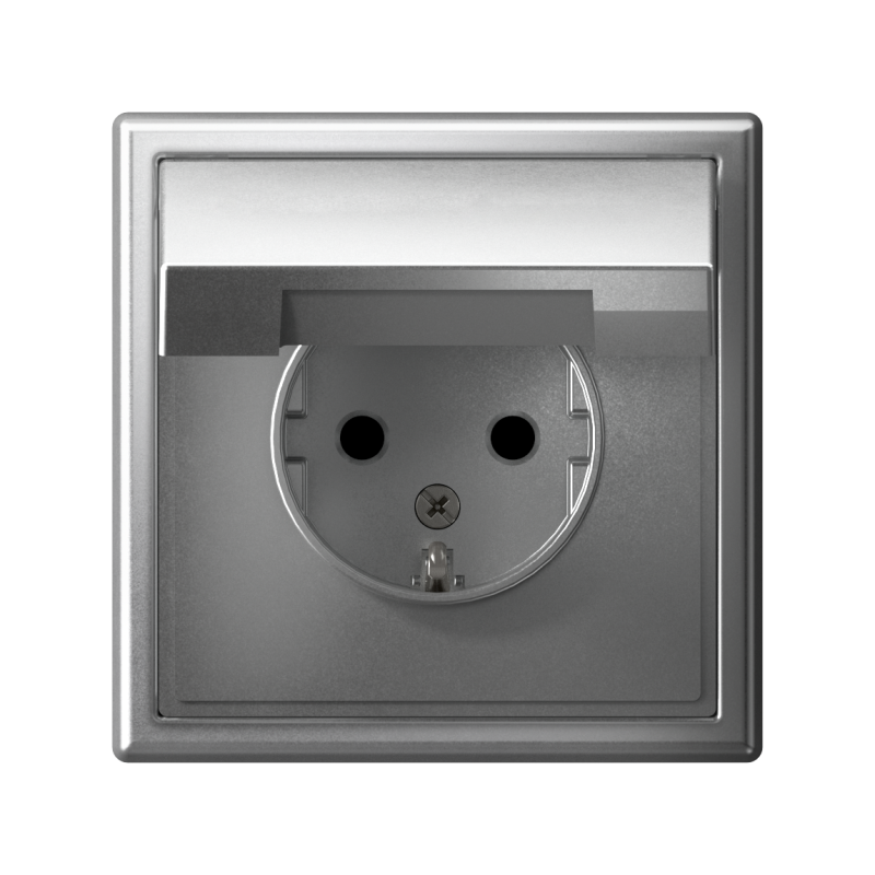 Механизм Systeme Electric серии ArtGallery в цвете алюминий розетки одинарной с заземлением, шторками и крышкой подходит для сетей 250 В, на ток 16 А.