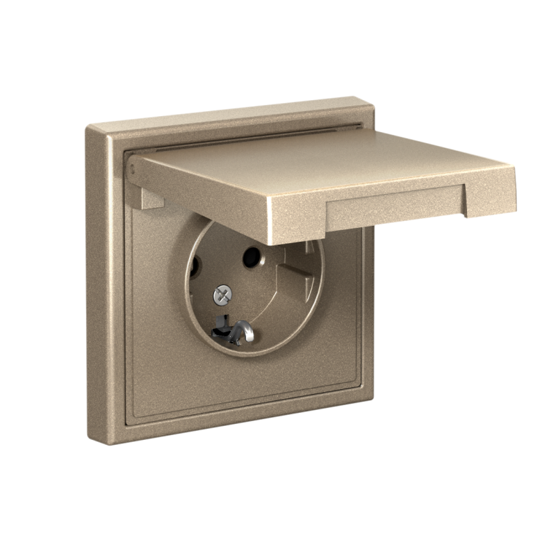 Механизм Systeme Electric серии ArtGallery в цвете шампань розетки одинарной с заземлением, шторками и крышкой подходит для сетей 250 В, на ток 16 А.