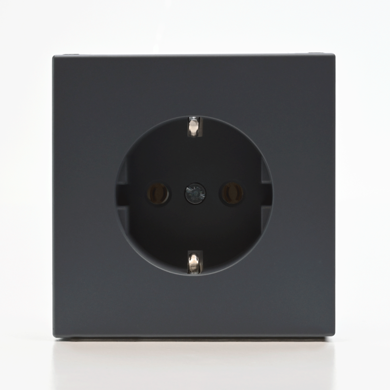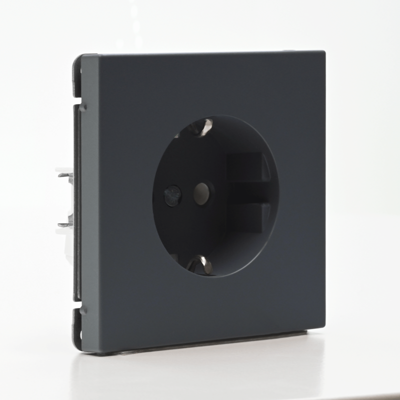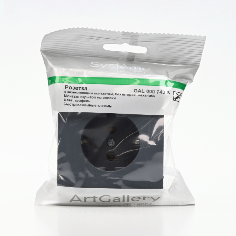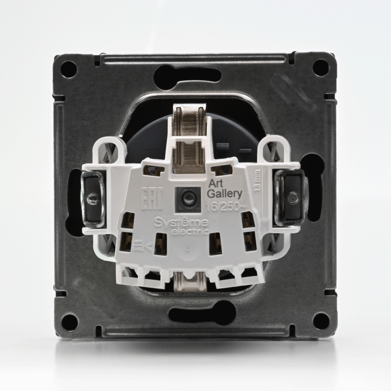 Механизм с быстрозажимными клеммами Systeme Electric серии ArtGallery в цвете грифель розетки одинарной с заземлением и без шторок подходит для сетей 250 В, на ток 16 А.