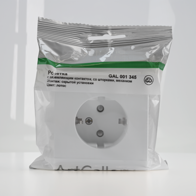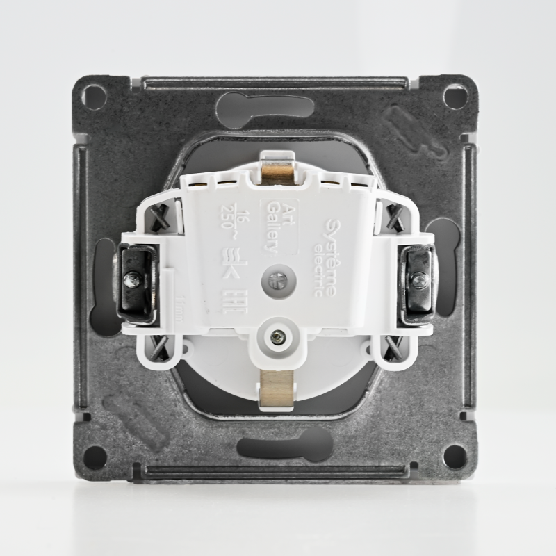 Механизм Systeme Electric серии ArtGallery в цвете лотос розетки одинарной с заземлением и шторками подходит для сетей 250 В, на ток 16 А.