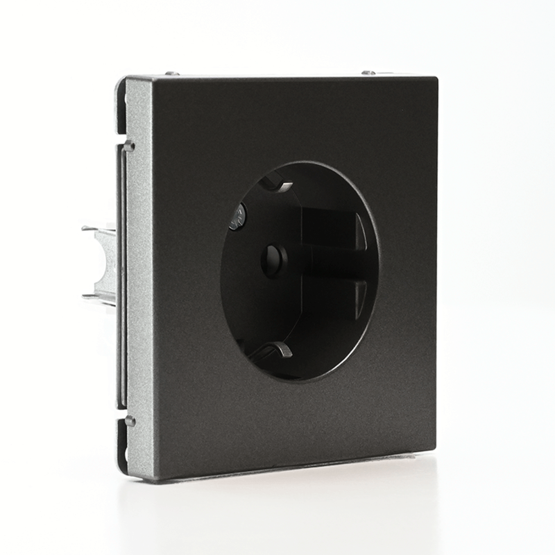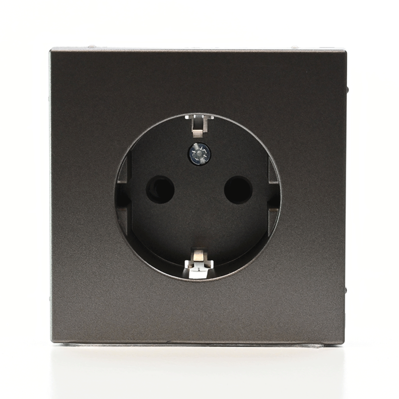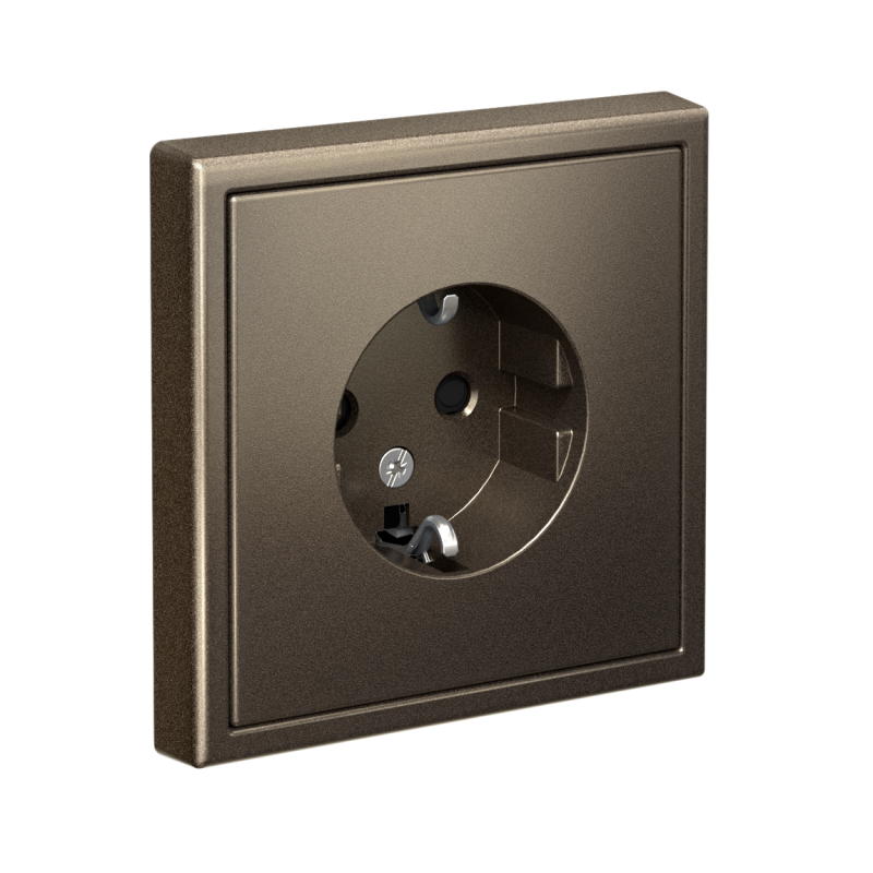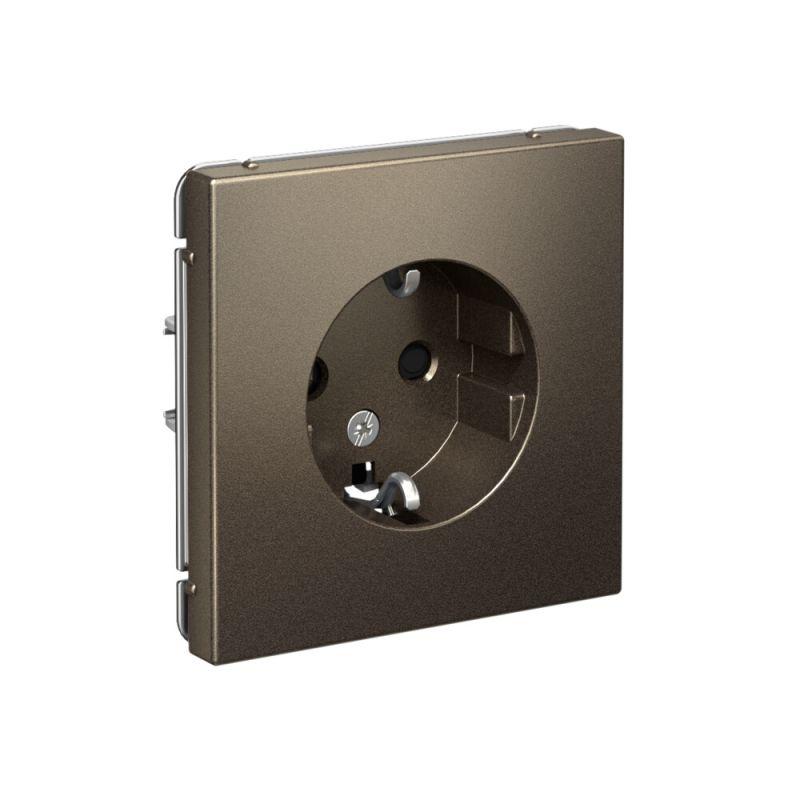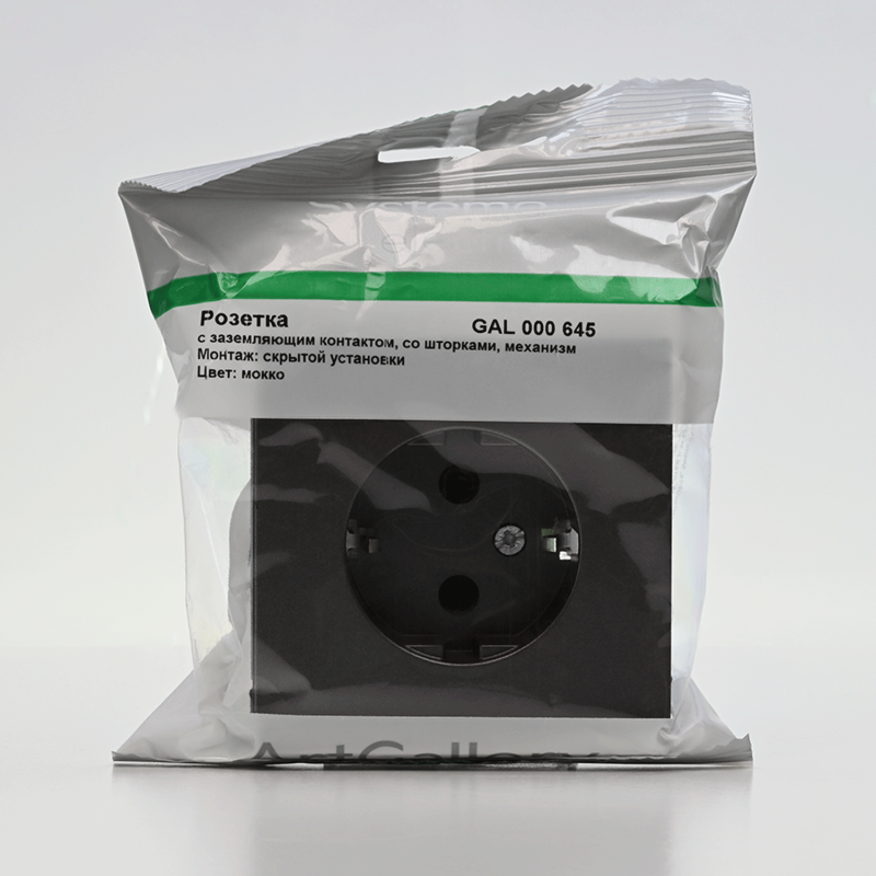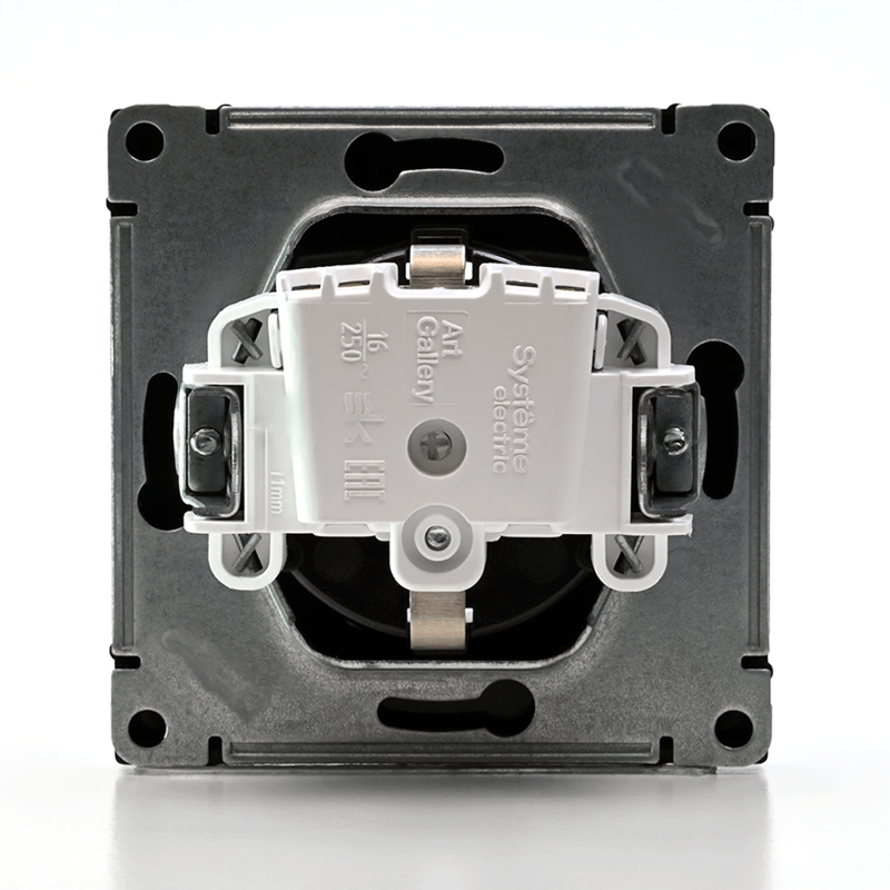 Механизм Systeme Electric серии ArtGallery в цвете мокко розетки одинарной с заземлением и шторками подходит для сетей 250 В, на ток 16 А.