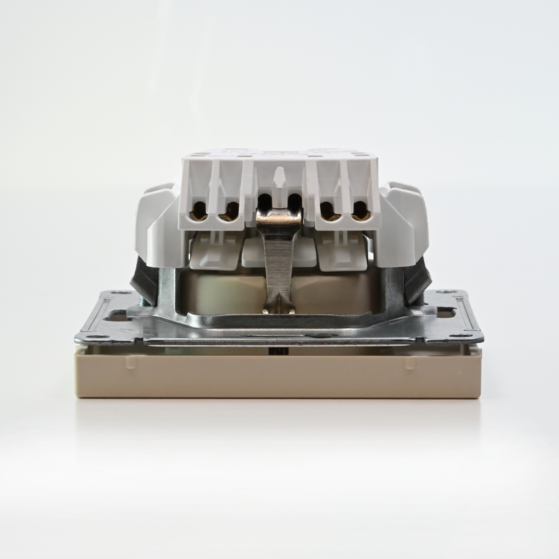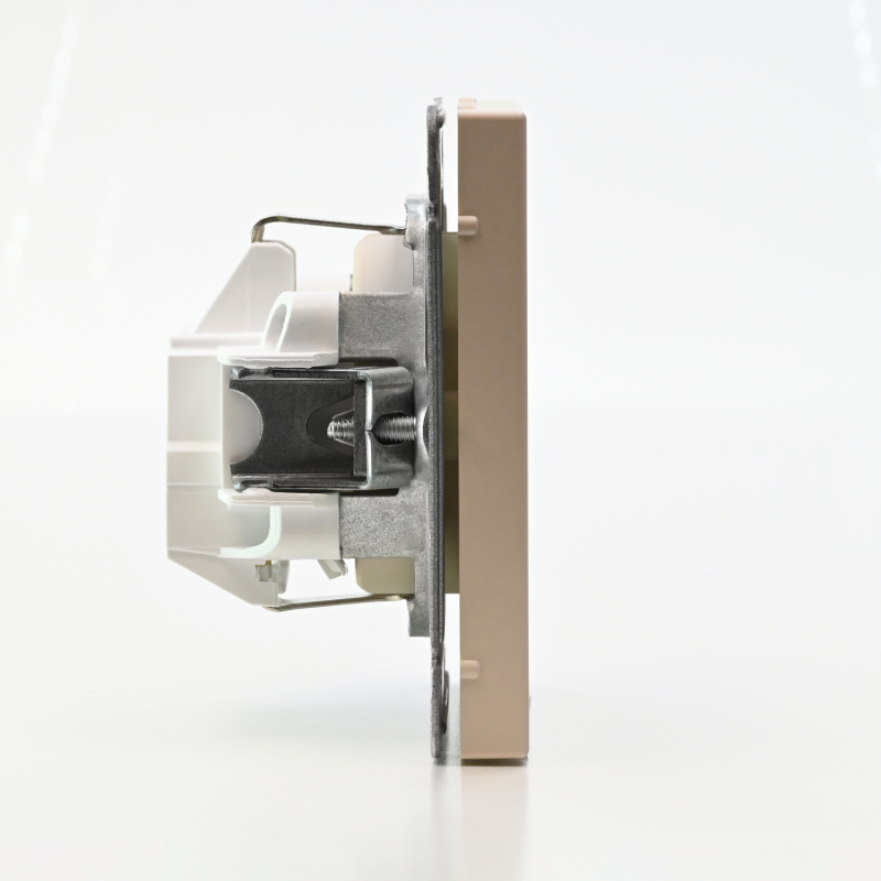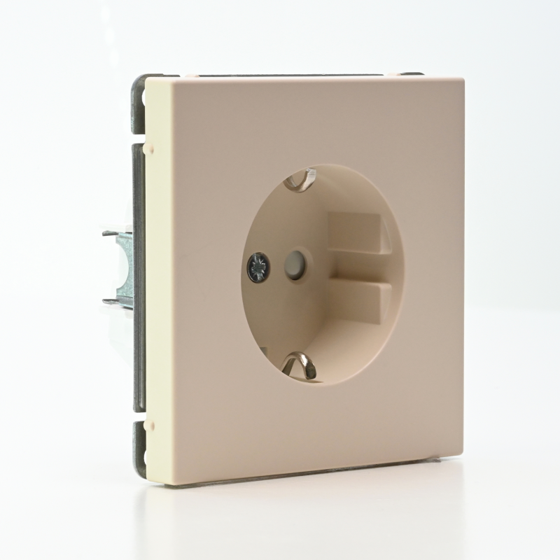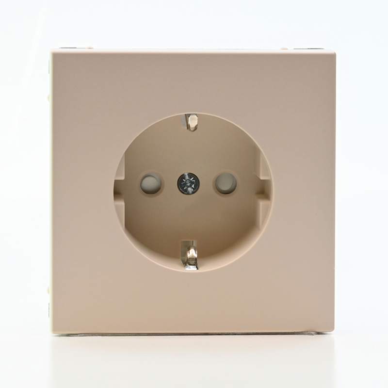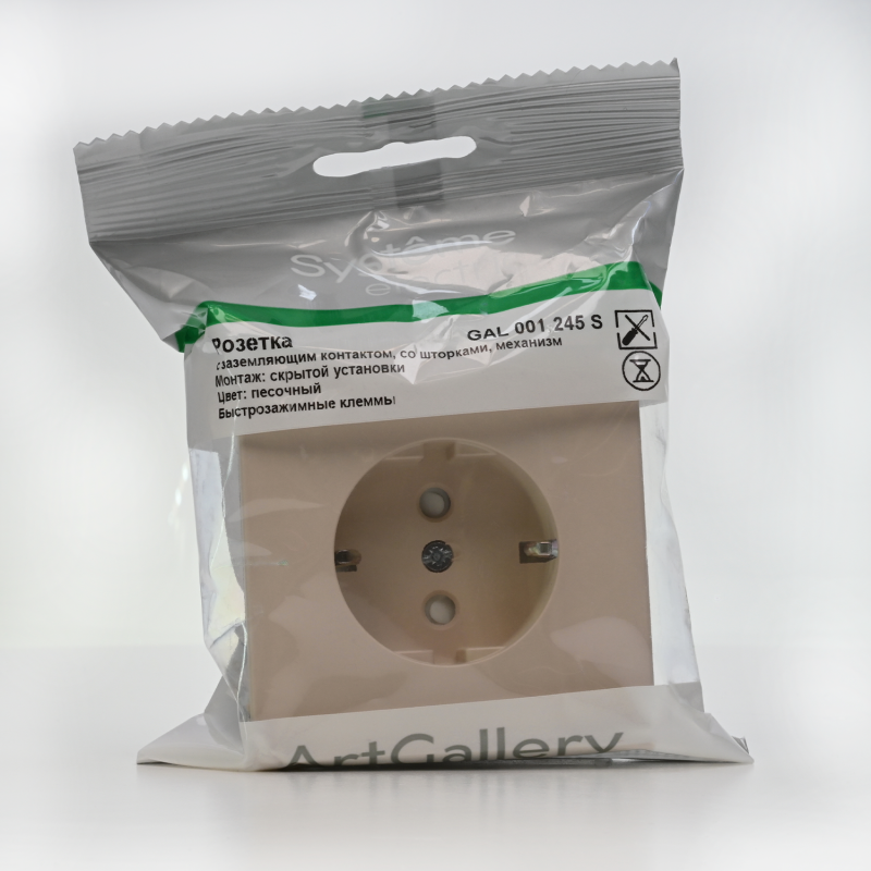 Механизм с быстрозажимными клеммами Systeme Electric серии ArtGallery в цвете песочный розетки одинарной с заземлением и шторками подходит для сетей 250 В, на ток 16 А.