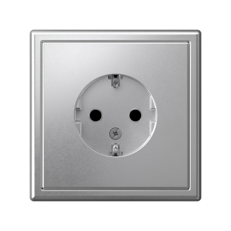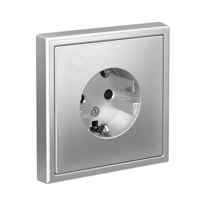 Механизм Systeme Electric серии ArtGallery в цвете алюминий розетки одинарной с заземлением и шторками подходит для сетей 250 В, на ток 16 А.