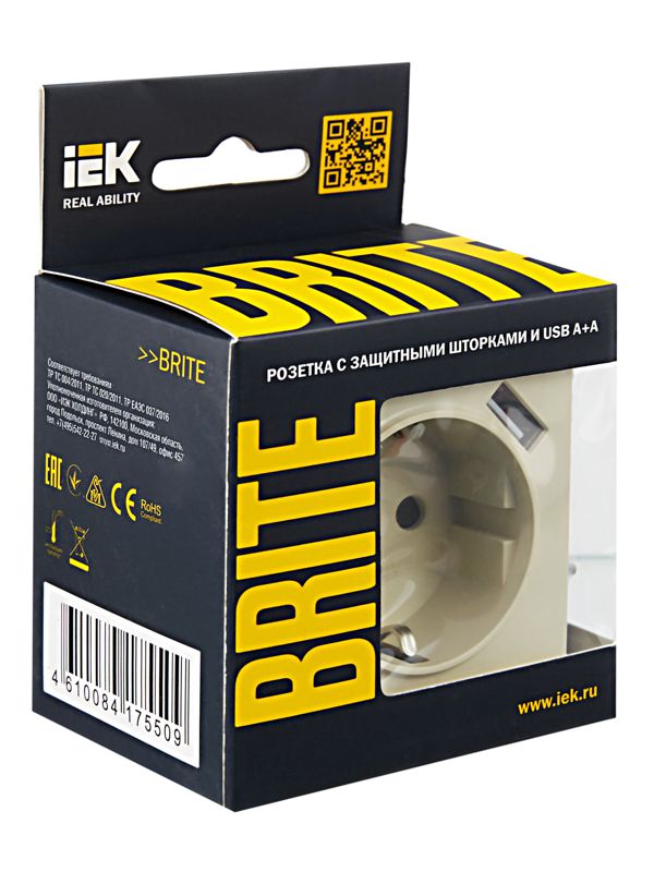 Розетка BRITE РЮш10-1-БрКр 16А с USB A+A 2.1А с заземл. защ. шторки беж. IEK BR-R14-16-U21-D21-K10