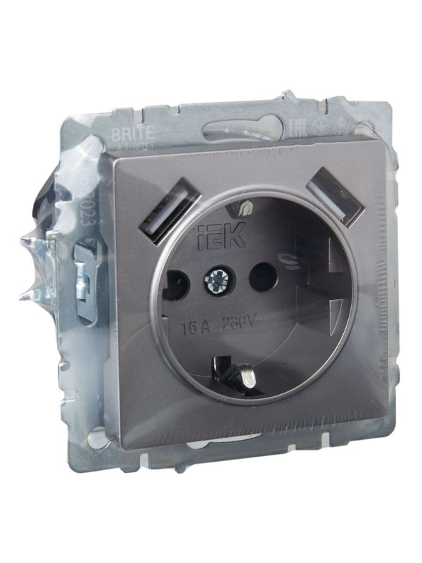 Розетка BRITE РЮш10-1-БрС 16А с USB A+A 2.1А с заземл. защ. шторки сталь IEK BR-R14-16-U21-D21-K46