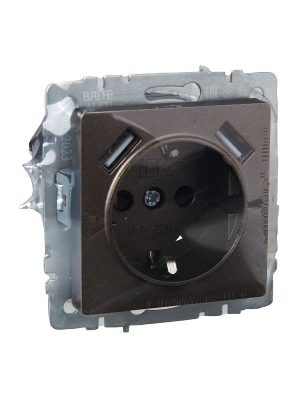 Розетка BRITE РЮш10-1-БрТБ 16А с USB A+A 2.1А с заземл. защ. шторки темн. бронза IEK BR-R14-16-U21-D21-K45
