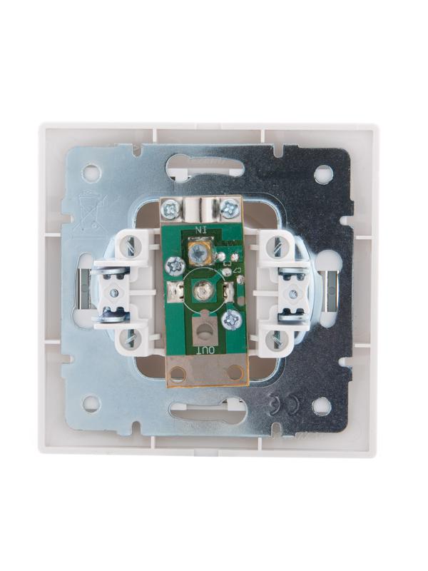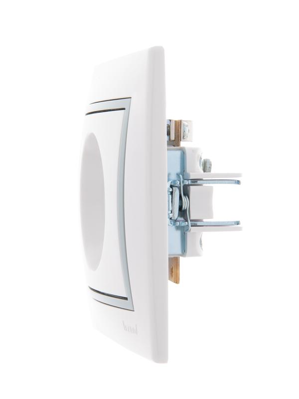 Корпус представляет собой форму из негорючего пластика, белого цвета, с защитными шторками, автоматически закрывающими гнезда розетки при вынутой вилке. Основание керамическое. Подпружиненные лапки крепления обеспечивают комфортный и легкий монтаж изделия. Предусмотрена возможность установки без применения монтажной коробки.
