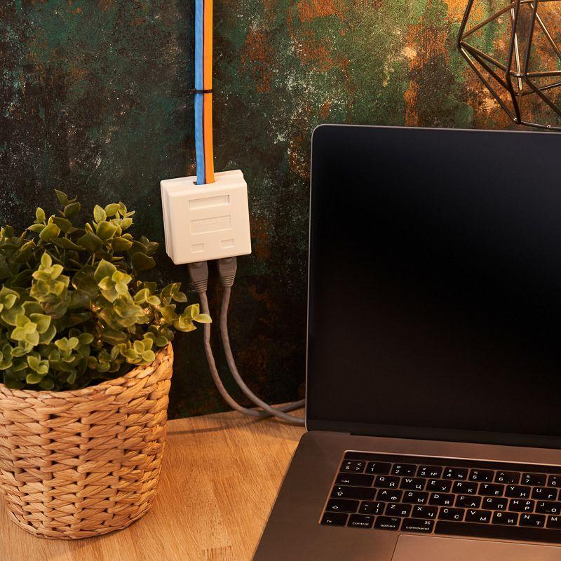 Сетевая розетка LAN предназначена для подключения компьютерных и телефонных кабелей к сети. Выполнена в белом цвете, оснащена двумя гнездами RJ-45 под разъем 8Р8С (8 посадочных мест и 8 контактов). Кабель фиксируется с помощью зажимных контактов.
