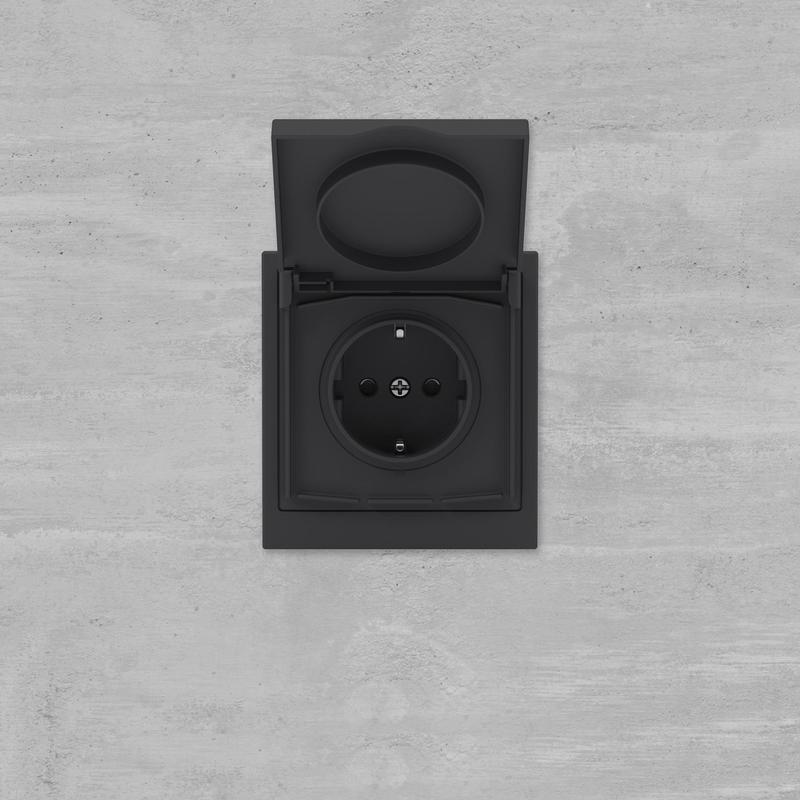 Розетка 2P+E (однофазная розетка с заземлением) с защитными шторками и крышкой применяется для подключения бытовых электроприборов во влажных помещениях. Предназначена для скрытого монтажа в стену. Характеристики устройства: номинальное напряжение 250 В, номинальный ток 16 А, степень защиты IP44. Материал: металл, поликарбонат. Пластиковые элементы имеют цвет "Черный уголь". Для декоративного оформления электроустановочных изделий используются рамки серии "KANT".