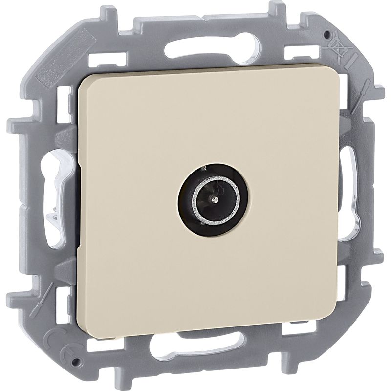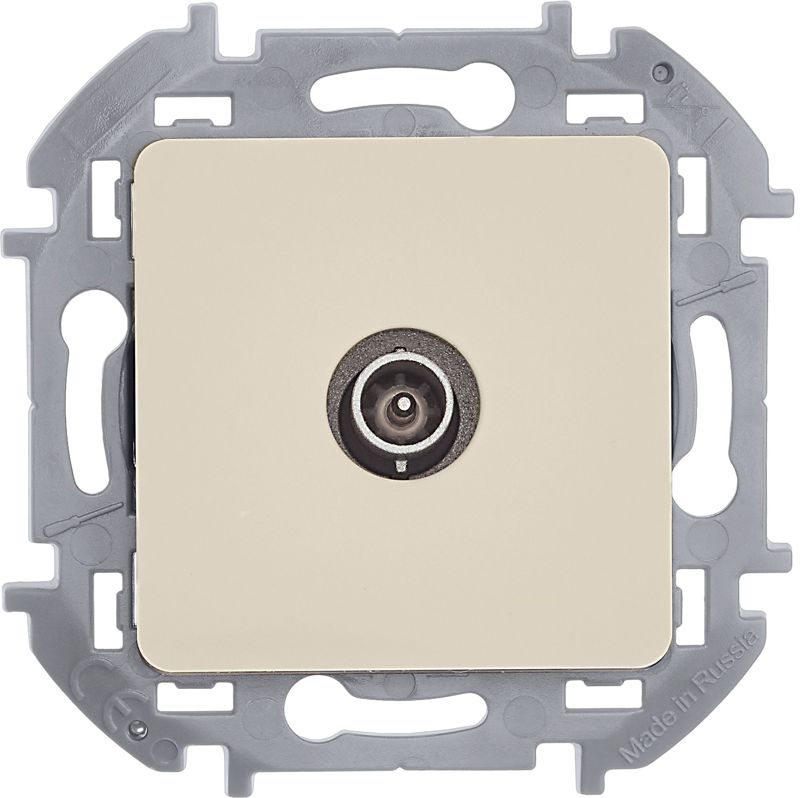 Розетка телевизионная для скрытого монтажа Inspiria, оконечная для схемы "шлейф", затухание 10дБ, 4-862МГц, цвет "Слоновая кость". Предназначена для подключения нескольких ТВ приемников к антенне, используется в схеме "шлейф" и устанавливается в конце линии.