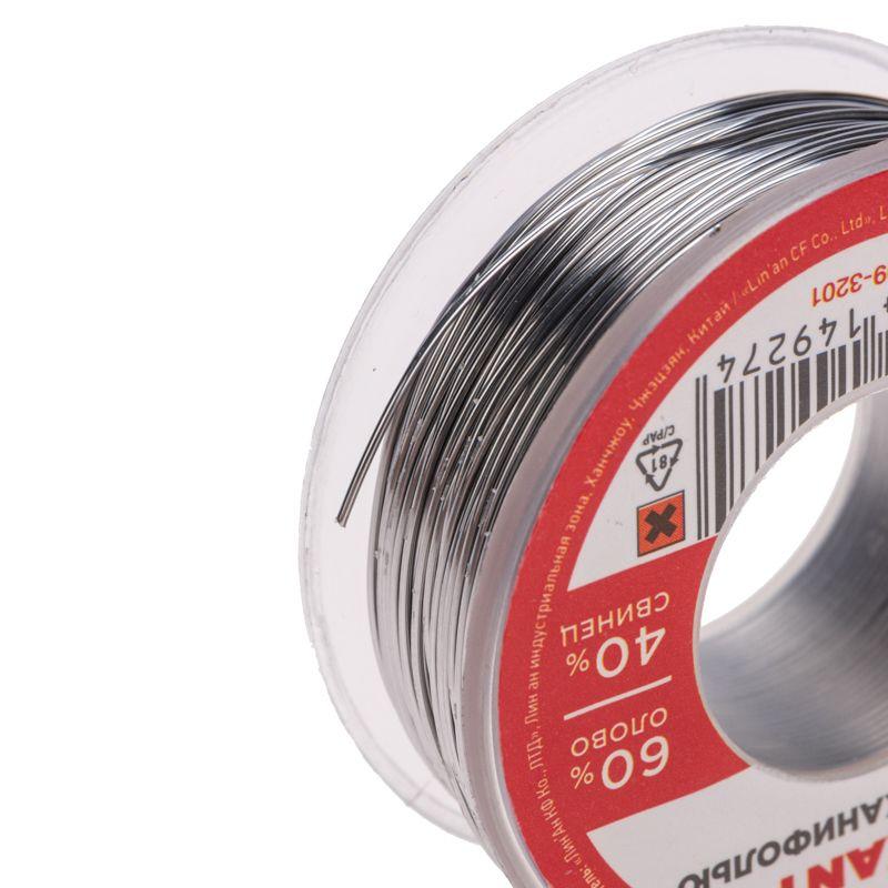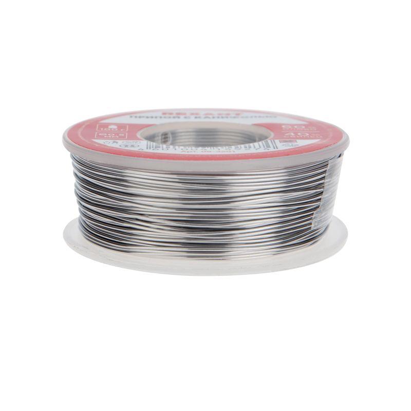Припой с канифолью REXANT представляет собой проволоку (диаметром 0.5 мм) из сплава олова (60 %) и свинца (40 %). Используется в пайке для соединения деталей между собой и позволяет создать герметичный, механически прочный (устойчивый) шов. Нагреваясь до температуры плавления (183...188 °C) припой: расплавляется, смачивает спаиваемый металл и, растекаясь по нему — заполняет место между соединяемыми деталями.