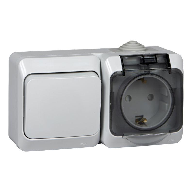 Блок ОП Этюд (розетка 16А 250В евростандарт с заземл. защ. шторки + 1-кл. выкл.) IP44 сер. SE BPA16-241C