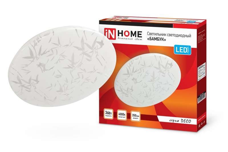Светодиодный светильник БАМБУК серии DECO от ТМ In Home в светлом матовом корпусе украшен принтом в виде стилизованных листьев бамбука. Согласно древнему китайскому учению фен-шуй, изображение этого растения приносит в дом удачу, счастье и процветание. Линейка светильников БАМБУК представлена в трех размерах от 190 до 350 мм. Несколько вариаций мощности (в диапазоне от 12 Вт до 36 Вт) позволяют подобрать оптимальный осветительный прибор, в зависимости от конфигурации и габаритов помещения. Применение Светодиодные светильники БАМБУК серии DECO предназначены для внутреннего освещения жилых помещений, подъездов и сферы ЖКХ, офисных и административных учреждений, магазинов, а также холлов, коридоров, лестничных пролётов, подсобок и других помещений вспомогательного назначения. Преимущества Современные светильники серии DECO, работающие на основе последнего поколения светодиодов, обеспечивают яркий равномерный световой поток при максимальной экономии электроэнергии. Отсутствие пульсации гарантирует сохранность здоровья глаз. Светодиодные светильники являются одним из самых экологически безвредных источников света и не требуют специальной утилизации и переработки. Светильники получили сертификат таможенного союза EAC. Производятся по ГОСТу Р МЭК 60598-1-2011. Монтаж Светодиодные светильники серии DECO применяются для работы в сетях переменного тока напряжением 230В ± 10% с частотой 50 герц. Перед установкой следует убедиться в правильности напряжения питающей сети и наличии защитного устройства в цепи (автоматический выключатель, предохранитель). Этапы установки: отключите сетевое напряжение, извлеките светильник из упаковки, открутите плафон светильника, повернув его по часовой стрелке. Через клеммную колодку подключите подготовленные концы проводов осветительного прибора к проводу сети. Установите светильник на поверхности и зафиксируйте при помощи дюбелей и саморезов. Сборку светильника следует осуществлять в обратной последовательности.