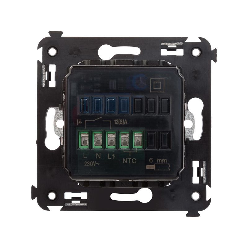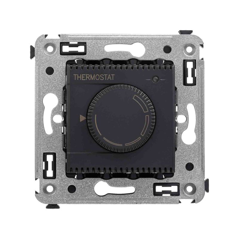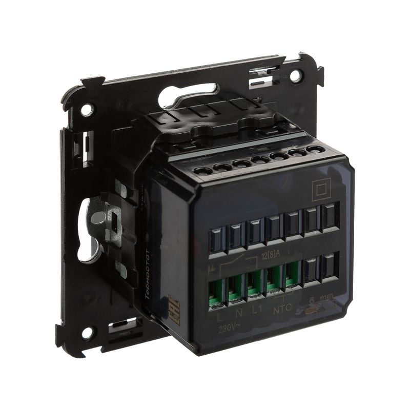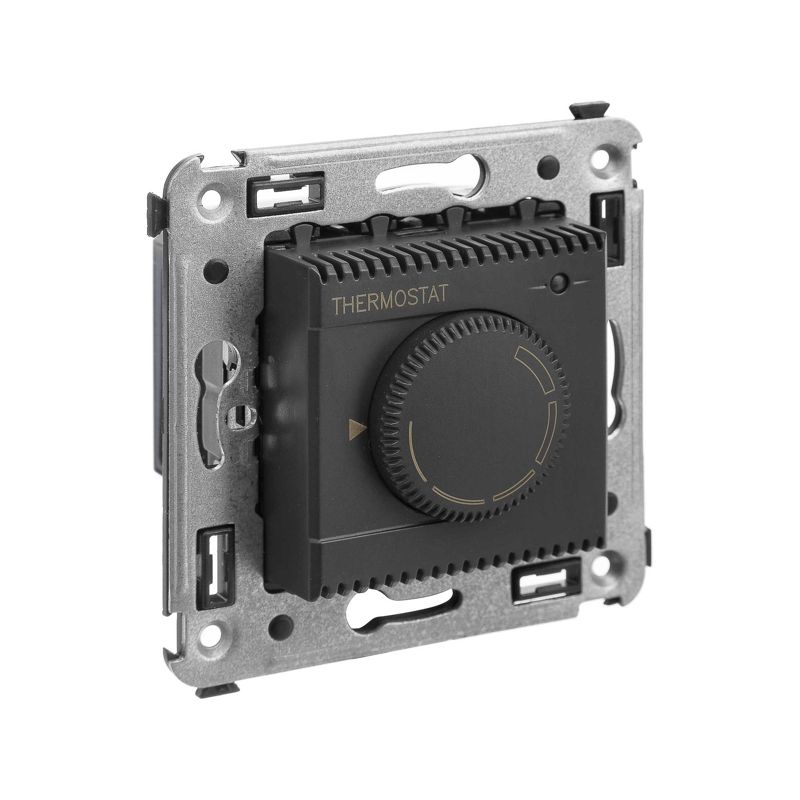 Термостат для теплых полов. Назначение: для монтажа в подрозеточные коробки глубиной не менее 45 мм (код 59301);. Предназначен для управления теплыми полами. Характеристики: диапазон от 5 до 30 °С; частота – 50–60 Гц; номинальное напряжение – 230 В; лампа-индикатор включается, когда температура в комнате падает ниже выбранного значения; нагрузка: 12 A – cos?=1; 4,8 A – cos?=0,4. Фиксация производится в подрозеточные коробки глубиной не менее 45 мм при помощи каркаса с лапками (код 4400802) и саморезов; провод датчика температуры в комплекте (длина 3,5 метра). 2 модуля. Цвет: "Черный матовый".