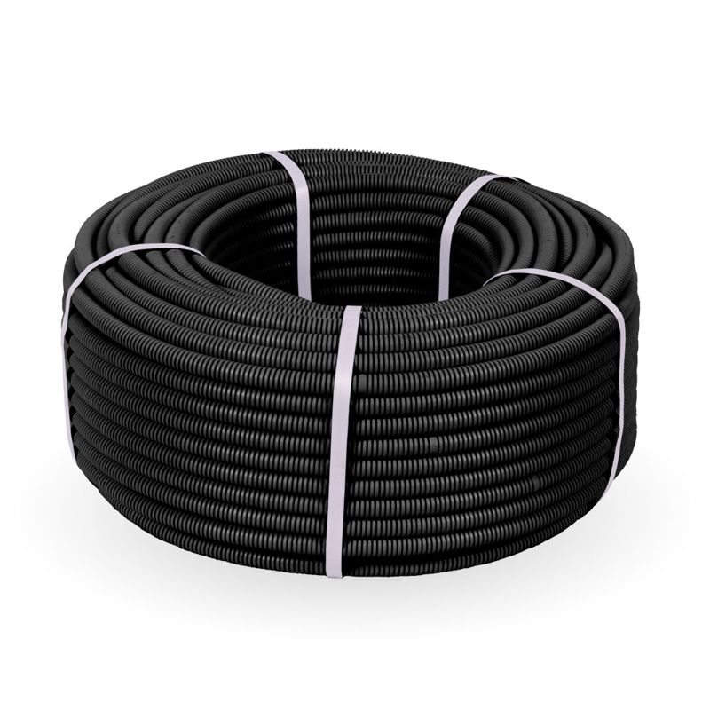 Гофрированные трубы из полиэтилена низкого давления отлично подходят для защиты изолированных проводов и кабелей от механических повреждений и агрессивного воздействия окружающей среды при прокладке сложных систем и трасс. Применяются для скрытой и открытой прокладки в несущих и ограждающих конструкциях из несгораемых материалов жилых, административных и производственных зданий и сооружений. Тип - строительная. Исполнение - безгалогенная (HF). Протяжка (зонд) - стальная проволока. Цветовое исполнение - RAL 9005 (черный).