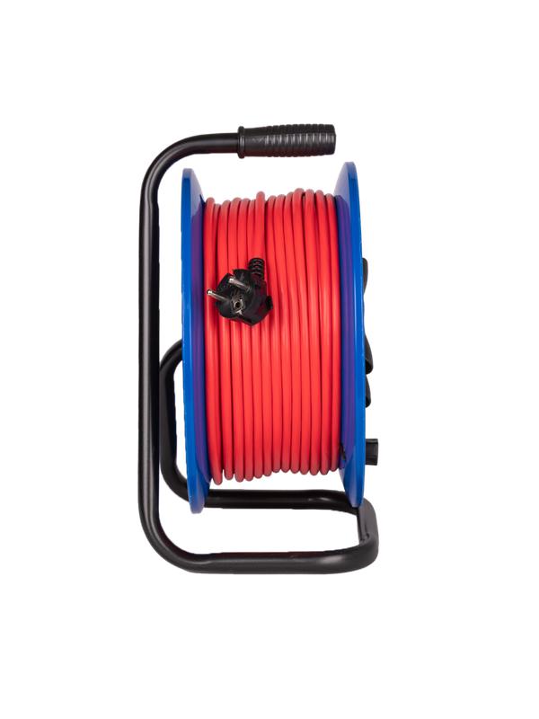 Удлинитель на катушке 50 метров на 4 гнезда с автоматическим предохранителем, с брызгозащитными крышками IP44 и заземлением. Кабель ПВС 3х1,5мм (с заземлением). Максимальная мощность подключения 3500 Вт. Удлинитель 16А подходит для мощных приборов, в том числе во влажных помещениях и при плохой погоде. Автоматический предохранитель выключит питание при опасном перегреве от нагрузки сверх допустимой нормы. Удачный выбор для профессионального строительства. Прочная стальная рама. Произведено в России.
