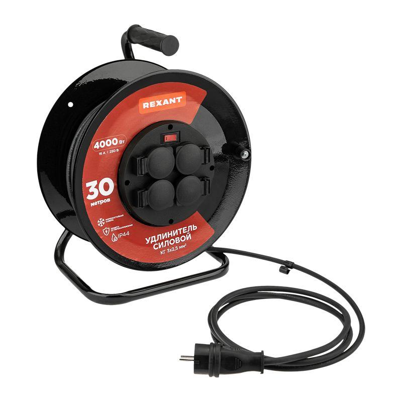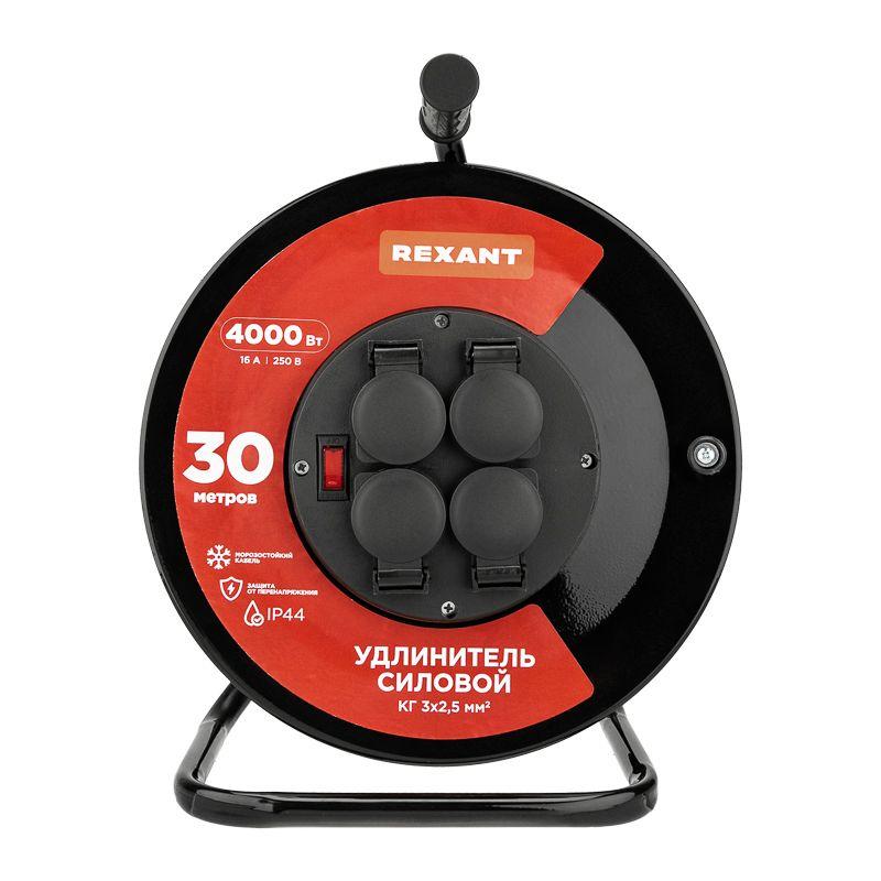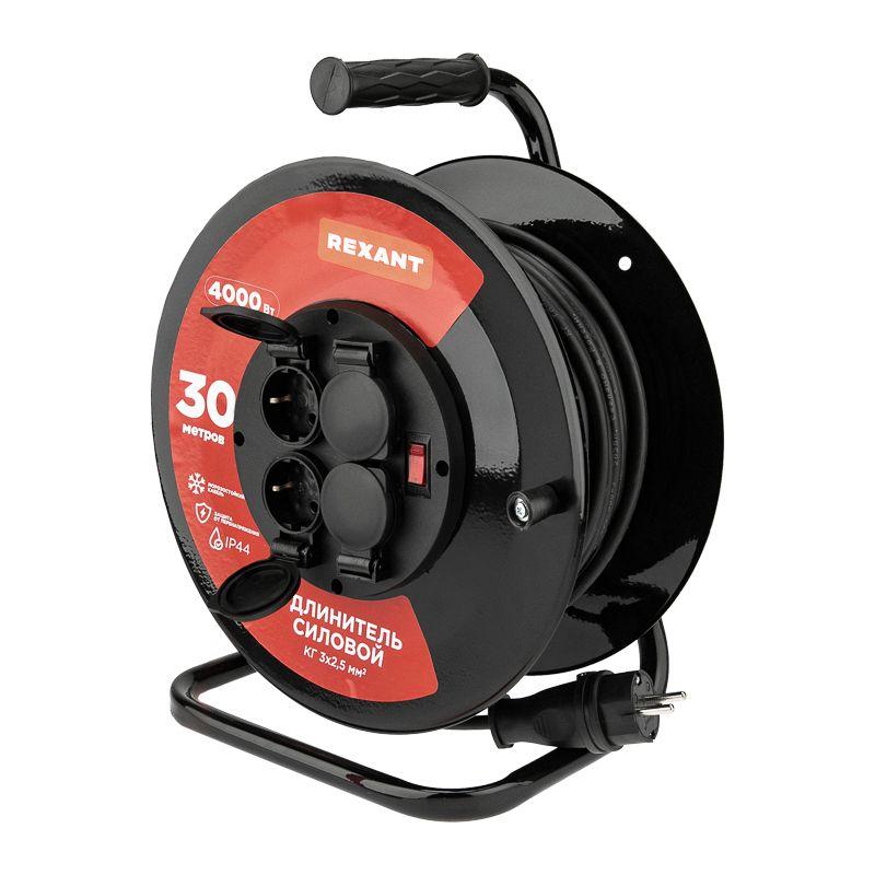 Удлинитель на метал. катушке 4х30м с заземл. IP44 КГ 3х2.5кв.мм с выключателем с защ. крышками Rexant 13-5014 -