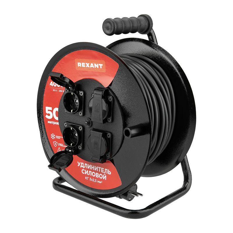 Удлинитель на метал. катушке 4х50м с заземл. IP44 КГ 3х2.5кв.мм с выключателем с защ. крышками Rexant 13-5016