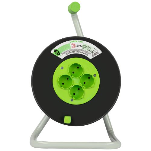Удлинитель силовой ЭРА GREEN LINE на пластиковой катушке KAT-2x0.75-20m, 4 розетки без крышек - IP20 без заземления. Провод ПВС 2х0,75мм2, 20м. Мощность 6А/1300Вт. Используется для работы на строительных площадках или дачных участках. Удобен при работе с приборами, находящимися удаленно от стационарной розетки. Например, газонокосилки, электрические, пилы, триммеры или электродрели. Рама катушки сделана из высокопрочной стали, а пластиковой корпус катушки выполнен с применением негорючих добавок.