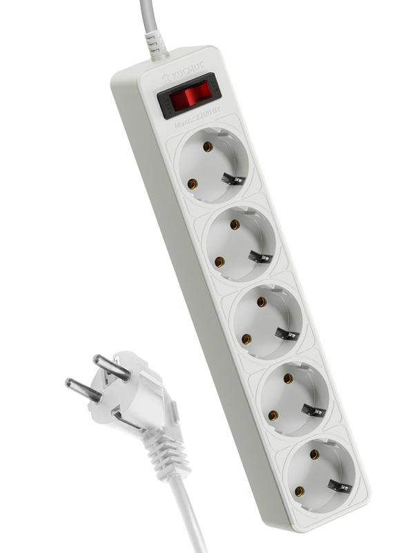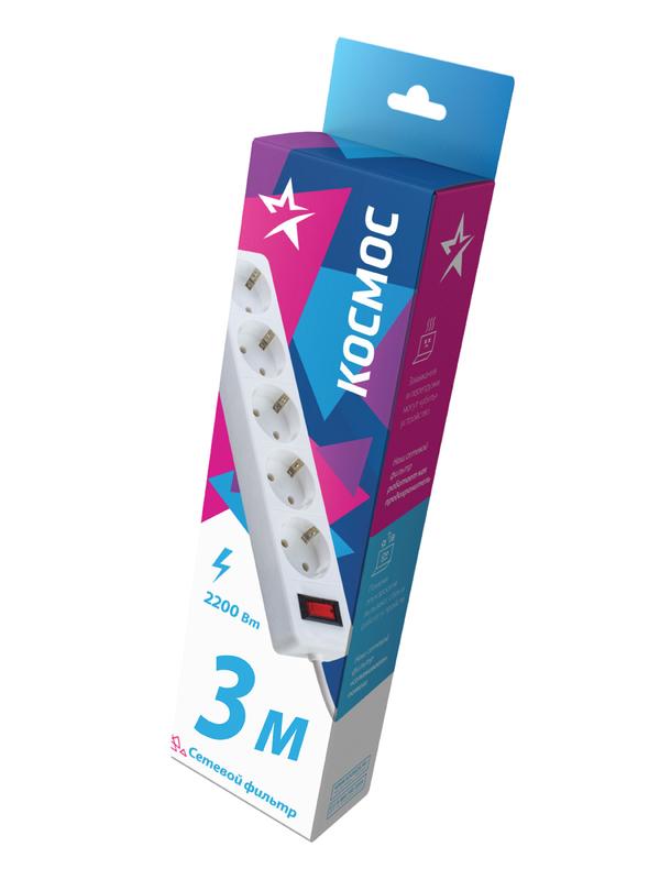Удлинитель с сетевым фильтром 5х3м с заземл. 10А IP20 2.2кВт ПВС 3х0.75 с выкл. с индикатором сети бел. КОСМОС FKsm3m-5g(W)