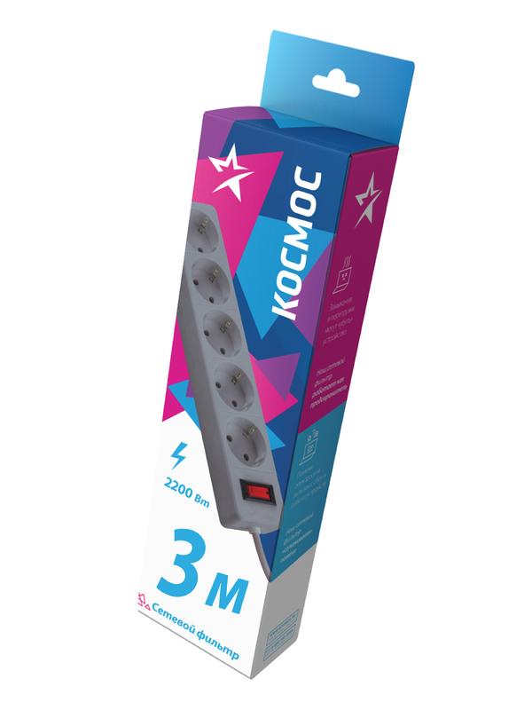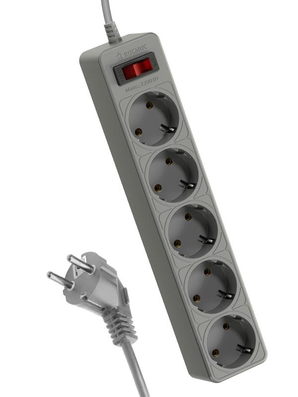 Удлинитель с сетевым фильтром 5х3м с заземл. 10А IP20 2.2кВт ПВС 3х0.75 с выкл. с индикатором сети сер. КОСМОС FKsm3m-5g(G)