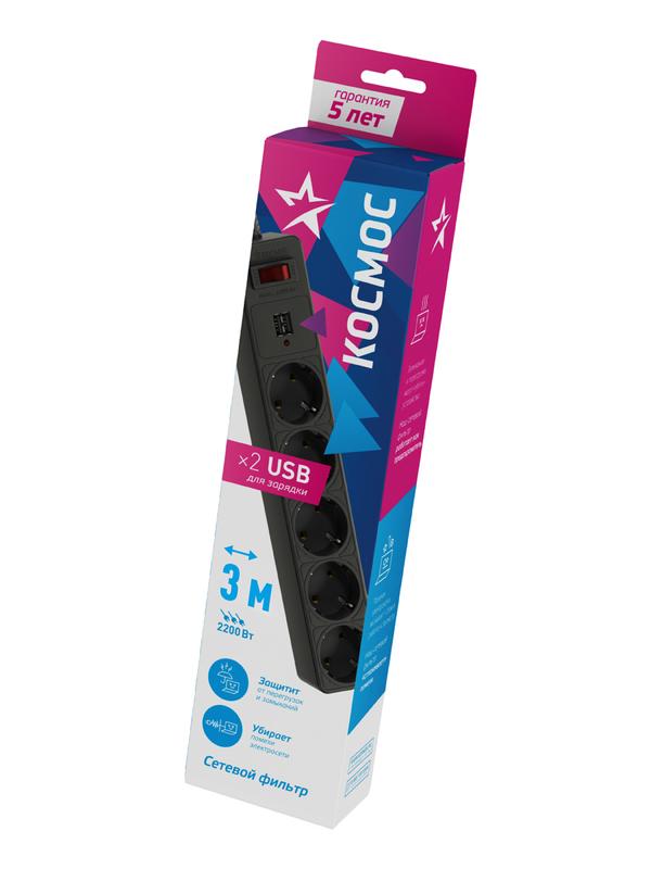 Удлинитель с сетевым фильтром 5х3м с заземл. 10А IP20 2.2кВт 2хUSB 3х0.75 с предохранителем КОСМОС FKsm3m-5g(B)USB