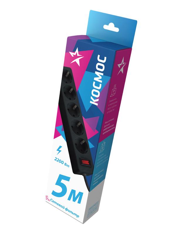 Удлинитель с сетевым фильтром 5х5м с заземл. 10А IP20 2.2кВт ПВС 3х0.75 с выкл. с индикатором сети черн. КОСМОС FKsm5m-5g(B)