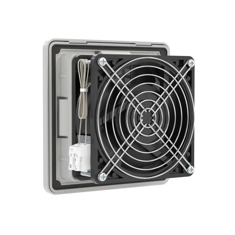 Вентиляторы RV изготовлены в России. Они обладают высоким качеством и надежностью, могут применяться даже в тяжелых условиях эксплуатации. Возможна работа на вдув или на выдув, благодаря простой смене направления вращения. Изготовлены из устойчивого к УФ и не поддерживающего горение АБС–пластика и поликарбоната. Допустима установка на улице без навеса. Степень защиты IP54, опционально повышение до IP56. Монтаж осуществляется без использования инструмента при помощи защелок (опционально можно зафиксировать винтами, например, при вибрационных нагрузках). В комплекте - воздушный фильтр с возможностью быстрой замены без инструмента. Внешние размеры 150х150 мм, размер монтажного выреза 124,5х124,5 мм. Номинальный воздушный поток при 50 Гц составляет 44 м3/ч. Цвет - светло-серый, RAL 7035.