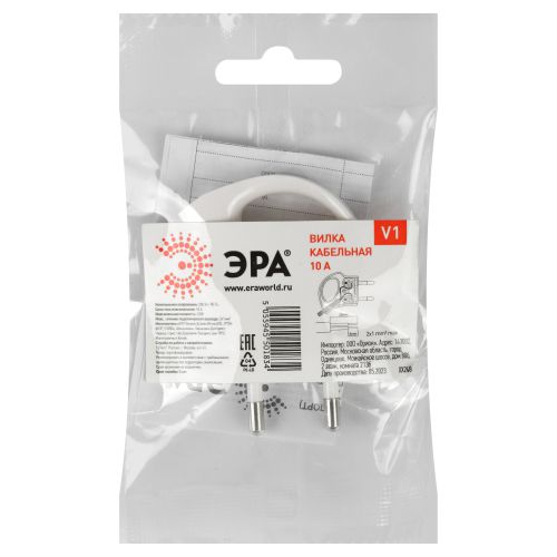 Вилка штепсельная ЭРА, максимальная мощность - 10A / 2200 В (кабель до 2x1мм2), поликарбонат