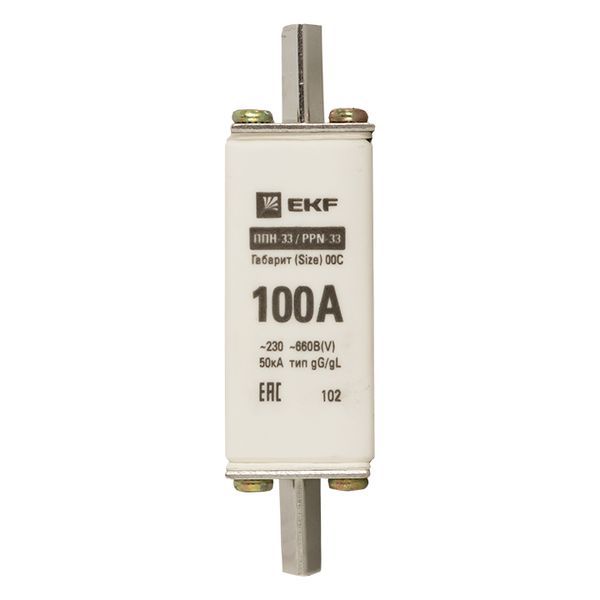 Плавкая вставка ППН-33 100/100А габарит 00С EKF. Предохранители плавкие ППН EKF, укомплектованные плавкими вставками типа gG/gL, предназначаются для защиты кабельных линий и промышленных электроустановок от токов перегрузки и короткого замыкания. Предохранители применяются в электрических сетях переменного тока частотой 50 Гц с напряжением до 660В. Применяются для крепления в распределительных и вводно-распределительных устройствах. Предохранители плавкие ППН могут устанавливаться в основание с держателем, а также в специально предназначенные рубильники. В комплект поставки предохранителей плавких ППН основание с держателем не входит и приобретается отдельно.