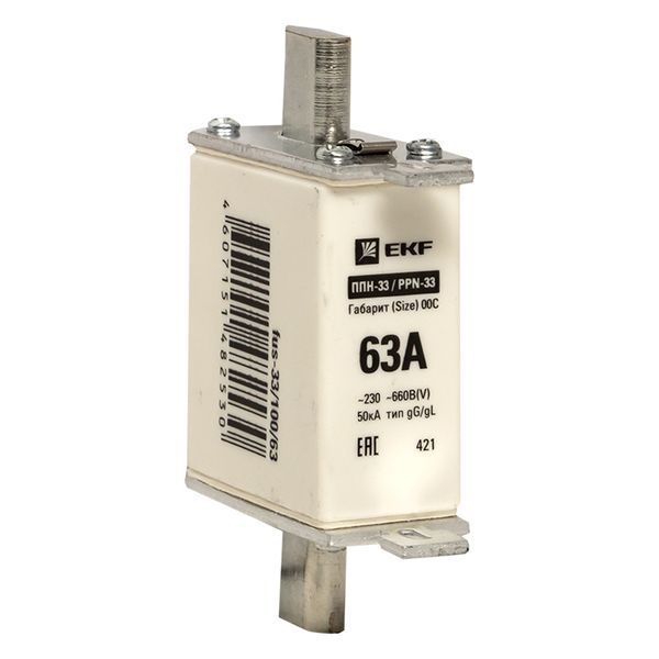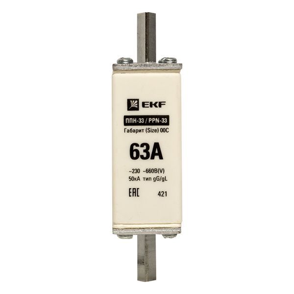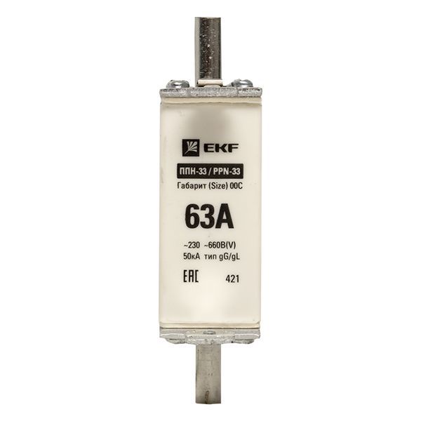 Плавкая вставка ППН-33 100/ 63А габарит 00С EKF. Предохранители плавкие ППН EKF, укомплектованные плавкими вставками типа gG/gL, предназначаются для защиты кабельных линий и промышленных электроустановок от токов перегрузки и короткого замыкания. Предохранители применяются в электрических сетях переменного тока частотой 50 Гц с напряжением до 660В. Применяются для крепления в распределительных и вводно-распределительных устройствах. Предохранители плавкие ППН могут устанавливаться в основание с держателем, а также в специально предназначенные рубильники. В комплект поставки предохранителей плавких ППН основание с держателем не входит и приобретается отдельно.
