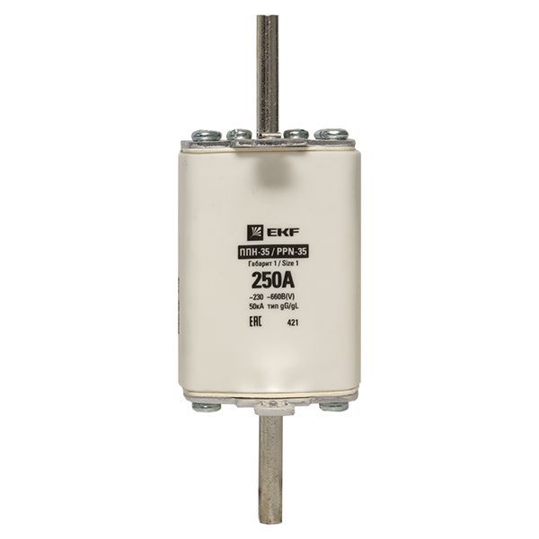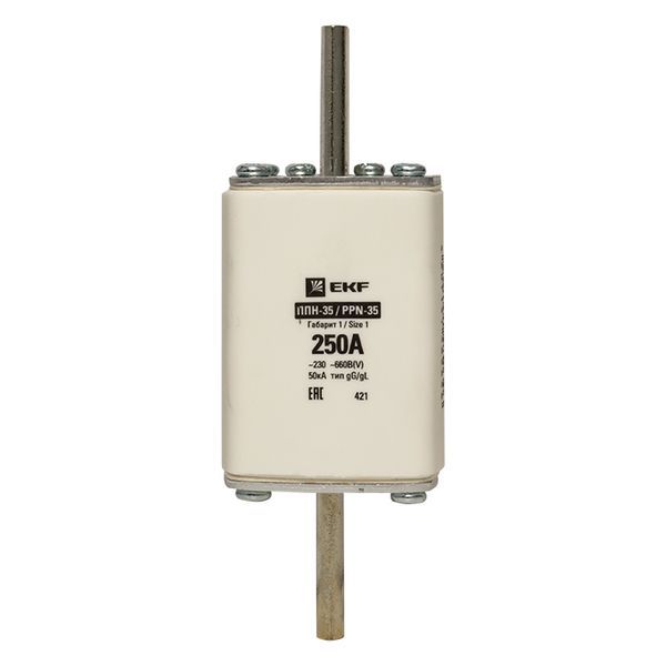 Плавкая вставка ППН-35 250/250А габарит 1 EKF. Предохранители плавкие ППН EKF, укомплектованные плавкими вставками типа gG/gL, предназначаются для защиты кабельных линий и промышленных электроустановок от токов перегрузки и короткого замыкания. Предохранители применяются в электрических сетях переменного тока частотой 50 Гц с напряжением до 660В. Применяются для крепления в распределительных и вводно-распределительных устройствах. Предохранители плавкие ППН могут устанавливаться в основание с держателем, а также в специально предназначенные рубильники. В комплект поставки предохранителей плавких ППН основание с держателем не входит и приобретается отдельно.