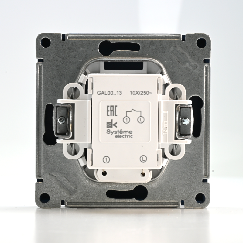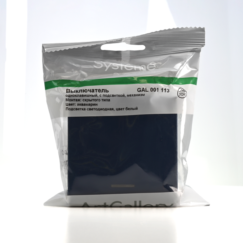 Механизм Systeme Electric серии ArtGallery в цвете аквамарин выключателя 1-клавишного с подсветкой подходит для сетей 250 В, на ток 10 А.