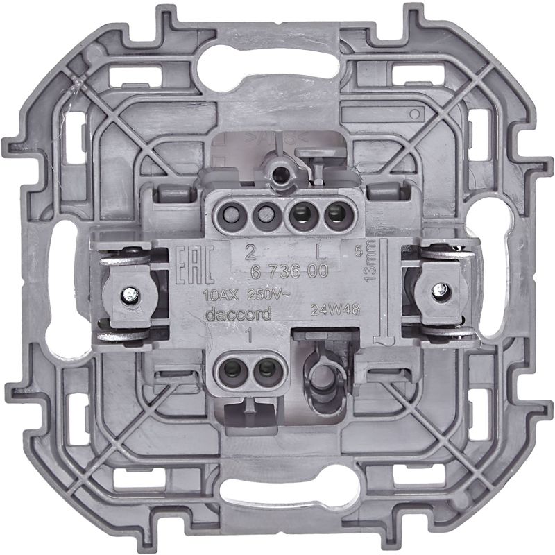 Выключатель одноклавишный скрытого монтажа Inspiria, цвет "Белый", номинальный ток 10АХ, напряжение ~250В, безвинтовые зажимы. Устанавливается в жилых и общественных помещениях для управления приборами освещения, вентиляции и т.д.