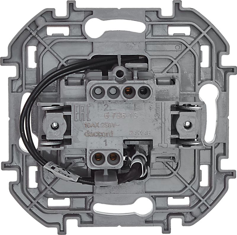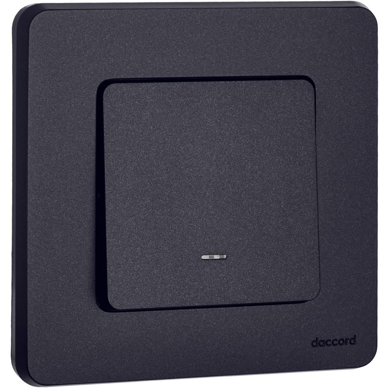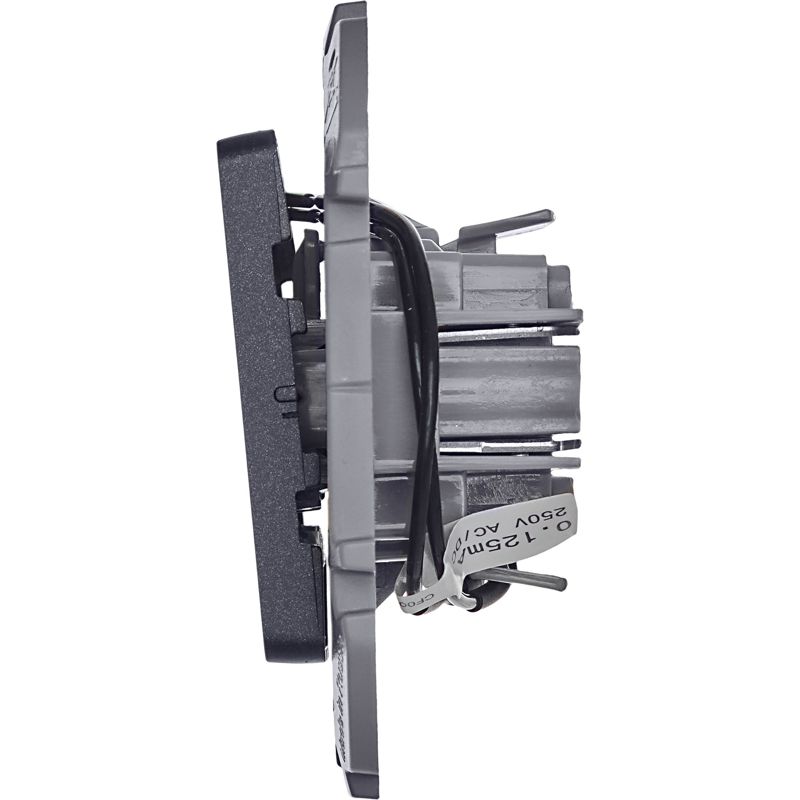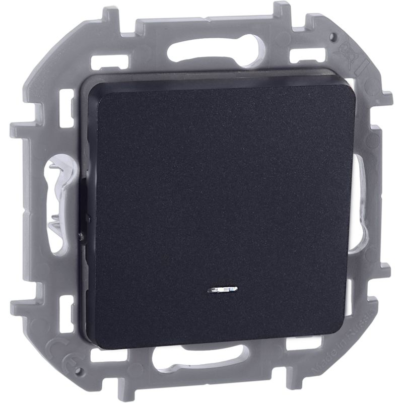 Выключатель одноклавишный с подсветкой/индикацией скрытого монтажа Inspiria, цвет "Антрацит", номинальный ток 10АХ, напряжение ~250В, безвинтовые зажимы. Устанавливается в жилых и общественных помещениях для управления приборами освещения, вентиляции и т.д.