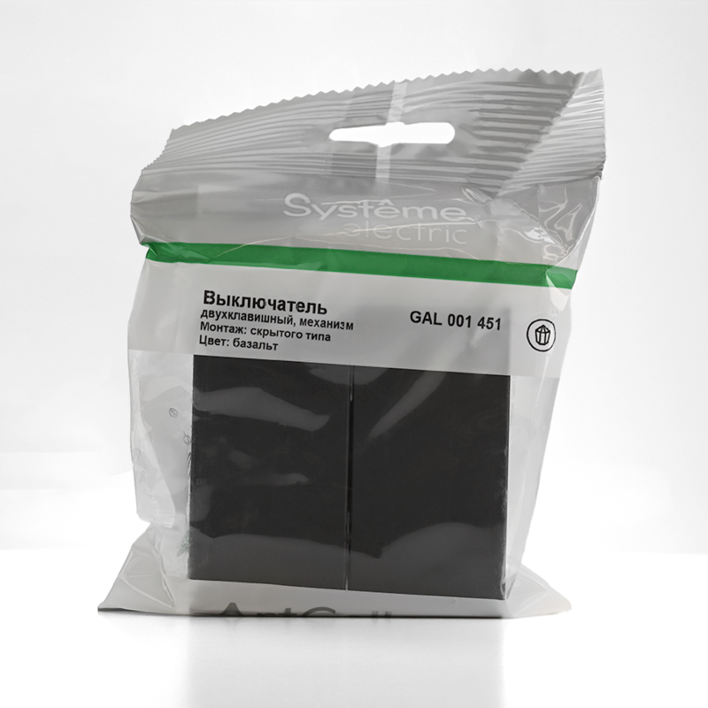 Механизм выключателя 2-клавишного Systeme Electric серии ArtGallery в цвете базальт подходит для сетей 250 В, на ток 10 А.