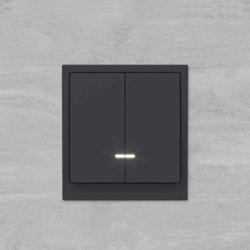 Двухклавишный выключатель с подсветкой применяется для управления контуром освещения. Выключатель предназначен для скрытого монтажа в стену. Характеристики устройства: номинальное напряжение 250 В, номинальный ток 16 А. Подсветка имеет белый цвет, предусмотрена для легкой идентификации устройства в темном помещении. Материал: металл, поликарбонат. Пластиковые элементы имеют цвет "Черный уголь". Для декоративного оформления электроустановочных изделий используются рамки серии "KANT".