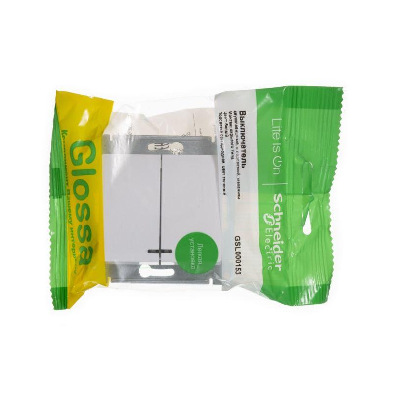 Механизм Systeme Electric (ранее Schneider Electric) серии Glossa (цвет белый) выключателя 2-клавишного с подсветкой подходит для сетей 250 В, на ток 10 А. Благодаря современной светодиодной подсветке зеленого цвета изделие легко найти в темноте. Двухклавишный выключатель позволяет управлять двумя источниками света с одной точки. Выполнен из материала PС+ASA, стойкого к УФ-излучению и появлению царапин. Эргономичные клеммы расположены в два ряда: сверху и снизу.