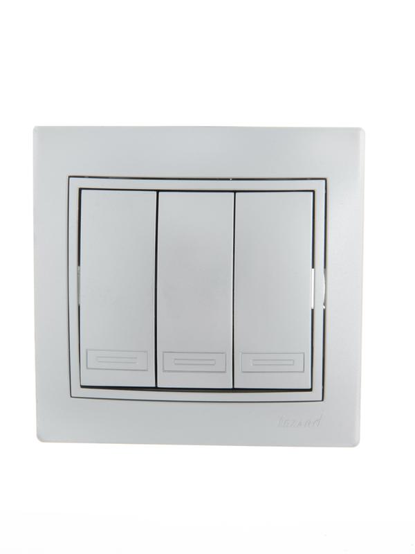 Выключатель 3-клавишный это двухпозиционный коммутационный аппарат с замыкающими (нормально-разомкнутыми) контактами, предназначенный для работы в сетях с напряжением до 1000 вольт, не предназначенный для отключения токов короткого замыкания, без специальных устройств дугогашения, местного управления, с ручным приводом.