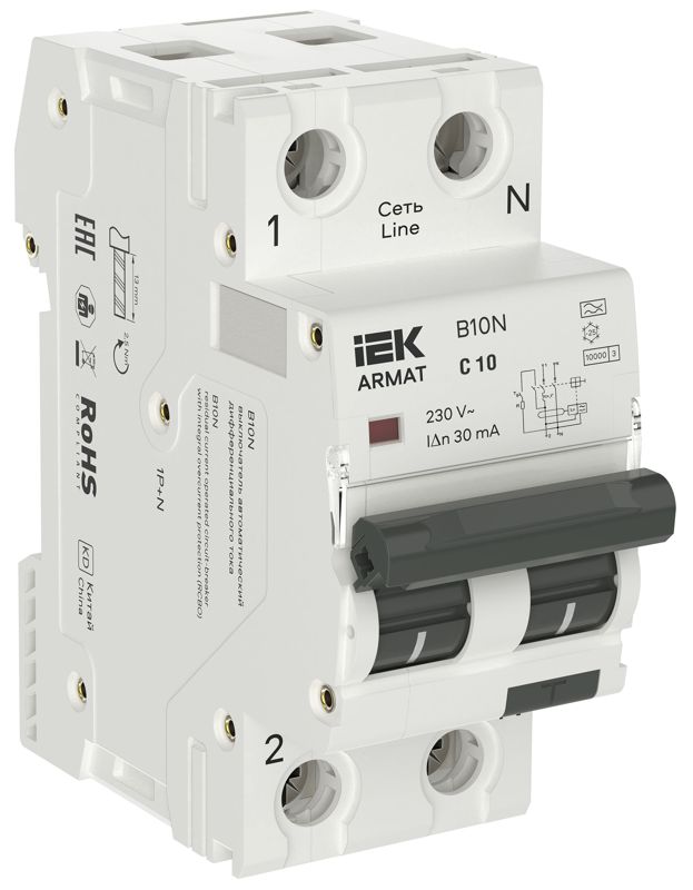 Выключатель автоматический дифференциального тока 2п (1P+NP) C 10 30мА тип A АВДТ B10N 36мм ARMAT IEK AR-B10N-1N-C010A030
