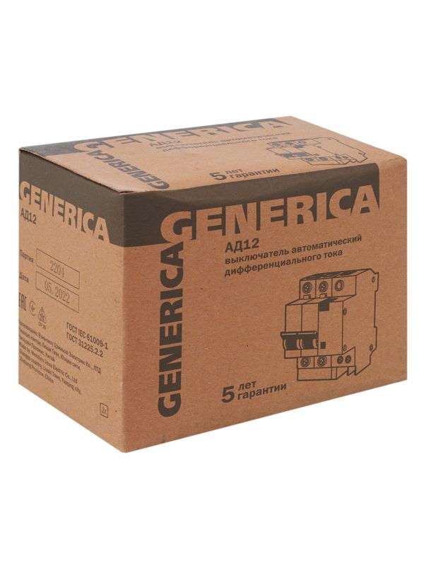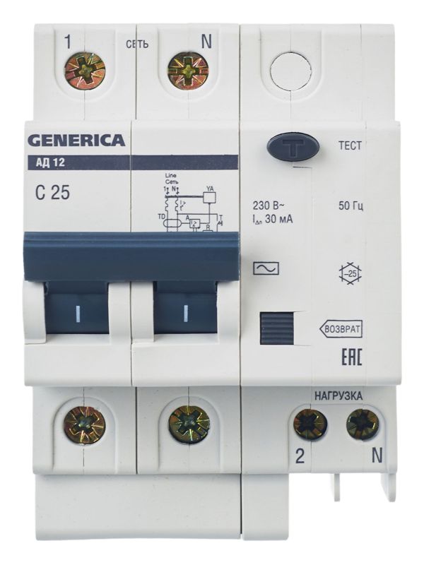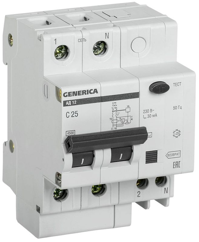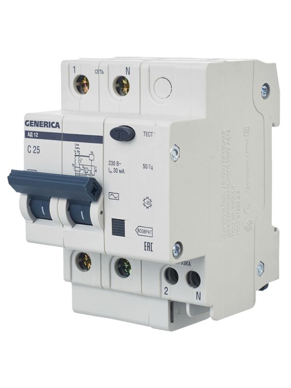 Выключатель автоматический дифференциального тока 2п 25А 30мА АД12 GENERICA MAD15-2-025-C-030