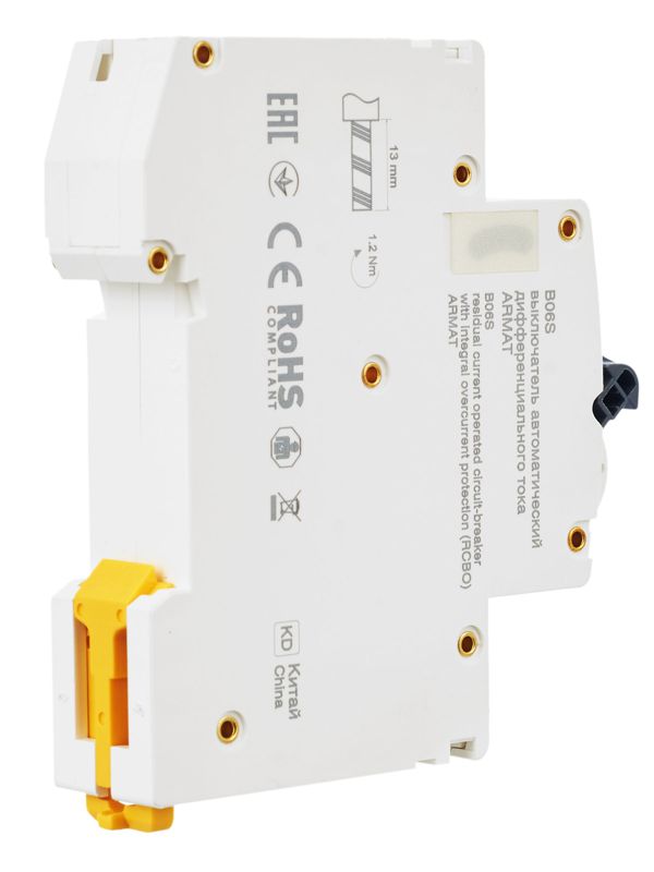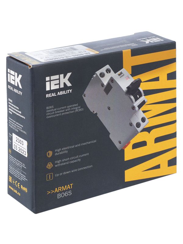 Автоматические выключатели дифференциального тока (АВДТ) ARMAT серии B06S могут осуществляют функции защиты от токов перегрузки и короткого замыкания и защиты человека от токов замыкания на землю. Модельный ряд включает в себя устройства с номинальными токами от 6 до 32 А, характеристиками срабатывания по сверхтоку B и C, типами защит AC и A с номинальным дифференциальным током отключения 30 мА. Номинальная отключающая способность АВДТ ARMAT серии B06S составляет 6 кА.