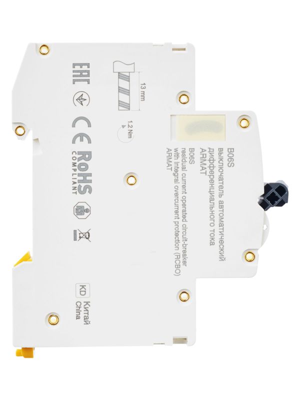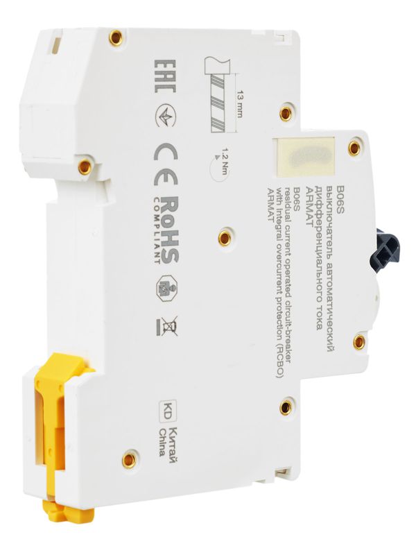 Автоматические выключатели дифференциального тока (АВДТ) ARMAT серии B06S могут осуществляют функции защиты от токов перегрузки и короткого замыкания и защиты человека от токов замыкания на землю. Модельный ряд включает в себя устройства с номинальными токами от 6 до 32 А, характеристиками срабатывания по сверхтоку B и C, типами защит AC и A с номинальным дифференциальным током отключения 30 мА. Номинальная отключающая способность АВДТ ARMAT серии B06S составляет 6 кА.