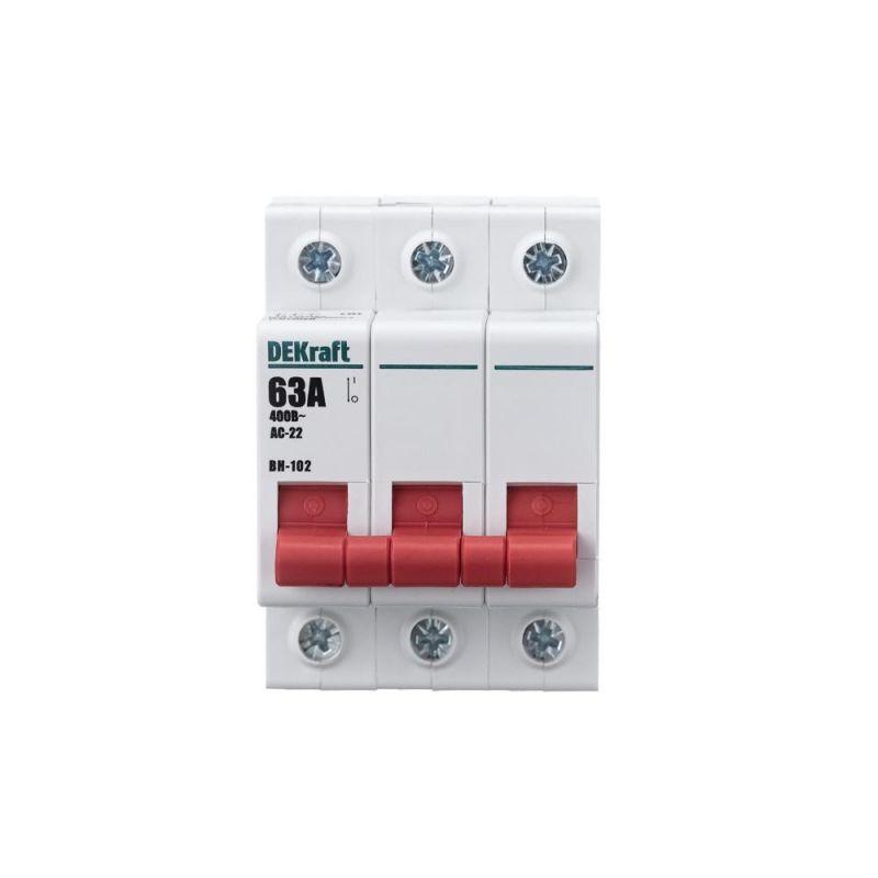 Выключатель-разъединитель серии ВН-102 Dekraft; 3P; номинальный ток 63 А; установка – на DIN-рейку; установочное положение - любое. Выключатели-разъединители применяются для ручного включения/отключения сетей напряжением до 400 В. Специальные мостиковые контакты обеспечивают надежный разрыв цепи; они полностью исключают возможность перекрытия дугой по изоляции. Усиленная рукоятка управления обеспечивает большое количество включений/отключений.