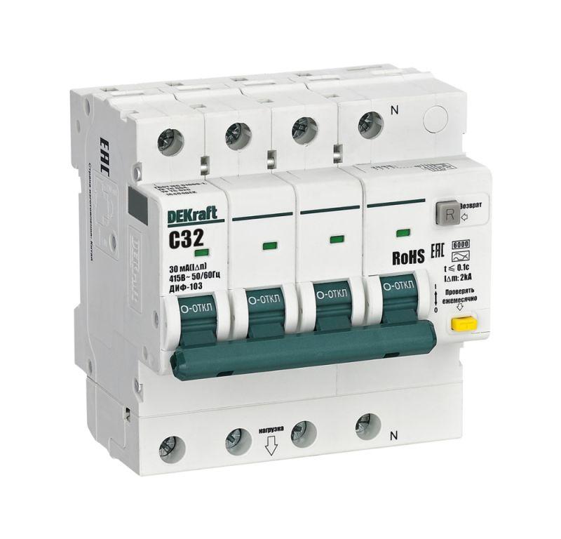 Автоматические выключатели дифференциального тока серии ДИФ-103 6кА NEW Dekraft; 3P+N; номинальный ток 32 А; ном. диф. ток 30 мА; тип диф. расцепителя - AC; кривая отключения - С; Icn, Ics = 6 кА; тип устройства - электронный; монтаж – на DIN-рейку. АВДТ обеспечивают три вида защиты — от короткого замыкания, перегрузки и возникновения утечки тока (в частности, вследствие прикосновения человека к токоведущим частям).