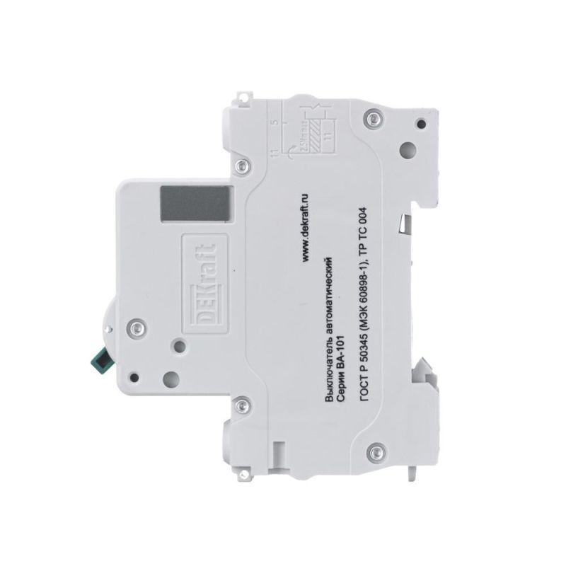 Автоматический выключатель серии ВА-101 Dekraft; 1P; номинальный ток 50 А; характеристика С; отключающая способность 4,5 кА. 5 монолитных заклепок повышают прочность корпуса аппарата. Сплошная лицевая панель обеспечивает безопасность эксплуатации аппарата. Боковые каналы охлаждения повышают стабильность работы при высоких температурах окружающей среды. Есть возможность установки дополнительных аксессуаров с левой стороны устройства. Аппарат на 100% совместим с корпусами Dekraft и Systeme Electric.